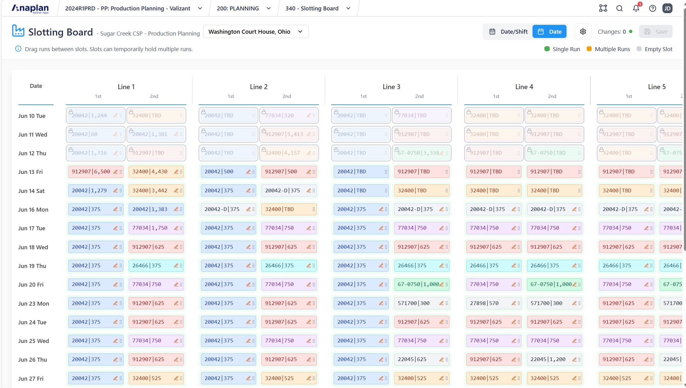 Production Line Loading continuously evaluates demand signals, line capacity, and constraints to determine the optimal placement, sequence, and release of work across production lines. The Slotting Board gives schedulers visibility into line utilization, sequencing trade-offs, and constraint impacts, shifting teams from manual scheduling to exception-driven execution control.